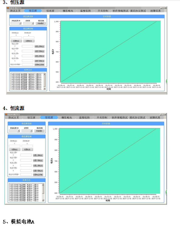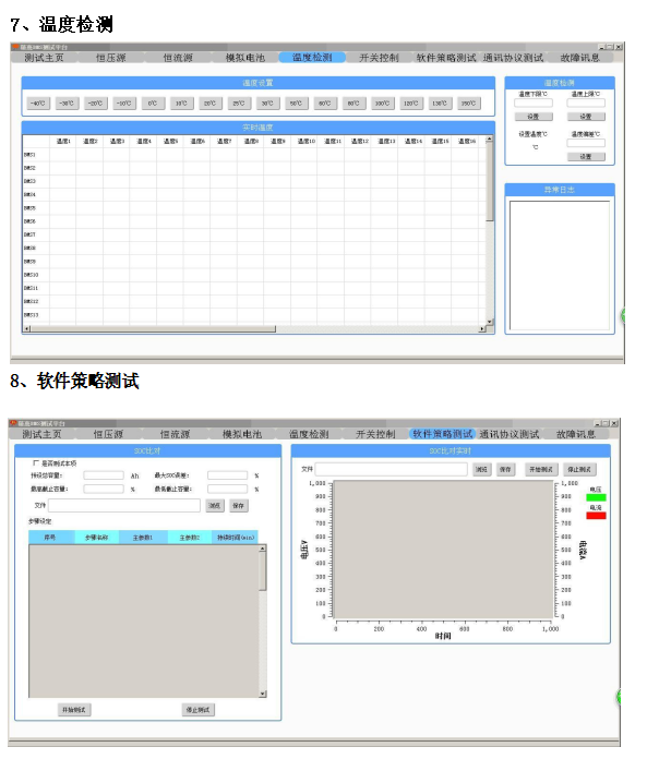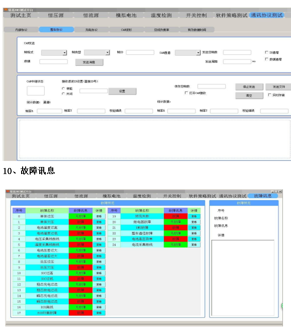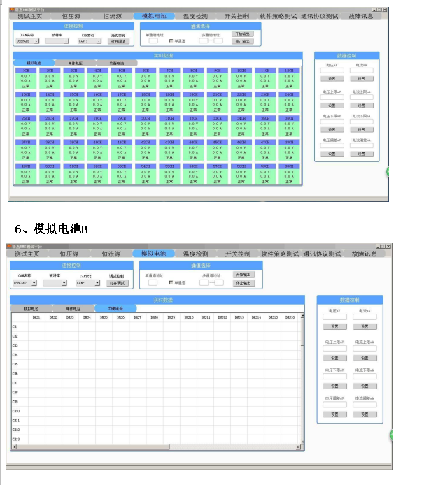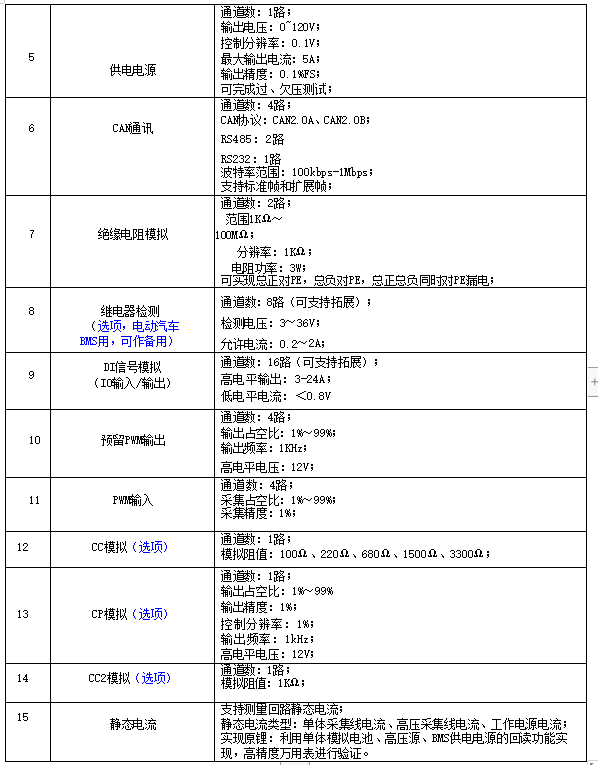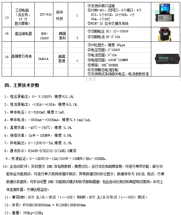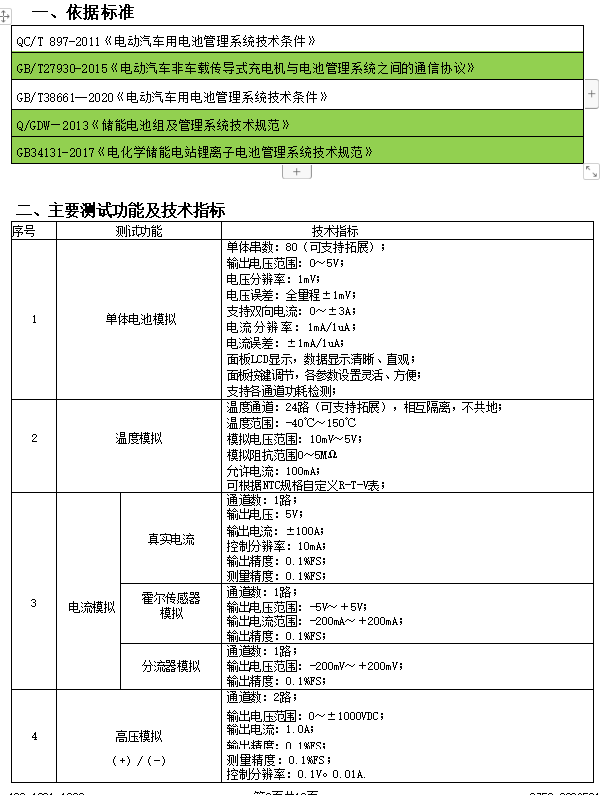 一、概述: 儀器用于檢驗(yàn) BMS 板高壓漏電報(bào)警試驗(yàn),提供所需的接地電阻值;測量 BMS 板總正/總負(fù)在不同的阻值情況下對地,模擬漏電情 況,檢測 BMS 對各種漏電情況的檢測及報(bào)警功能。 儀器與工控機(jī)連接,實(shí)現(xiàn)遠(yuǎn)程參數(shù)設(shè)置及讀取,通過協(xié)議也可把設(shè)備軟件添加到測試上位機(jī),即可一鍵測試。 二、供電要求 1. 支持輸入電壓范圍:12V。 2. 每塊板耗電電流最大0.3A。 三、輸出電阻 1. 最小可設(shè)定電阻為100Ω,步進(jìn)精度為100Ω。 2. 最大可設(shè)定電阻為55000000Ω。 3. 輸出電阻精度: 0.5%。 四、通信接口 1. 采用RS485通信 2. 通信波特率為9600bps。 五、產(chǎn)品框架圖 1.原理框架 系統(tǒng)采樣級聯(lián)電阻板的形式,通過通訊線連接到下一塊電阻板,緊接著電阻板通過通訊線把控制信號連接到上位機(jī)。 2.實(shí)物說明 六、通訊協(xié)議 1、 RS485通訊接口,異步半雙工通訊模式。 2、 通訊波特率9600bps。 3、 數(shù)據(jù)格式: 8個數(shù)據(jù)位、無校驗(yàn)位、1個停止位。 4、 報(bào)文格式說明: 4.1設(shè)置電阻值:功能碼 :01H   報(bào)文格式:設(shè)備地址碼 + 01H + 功能碼 + 數(shù)據(jù)長度 + 數(shù)據(jù)高位 + 數(shù)據(jù)次高位 + 數(shù)據(jù)次低位  + 數(shù)據(jù)低位 + CRC低位 + CRC高位 電阻設(shè)置范圍0-55000000Ω   例: 設(shè)置設(shè)備地址1電阻值1000Ω      上位機(jī)以16進(jìn)制發(fā)送:01 01 01 04 00 00 03 E8 61 A8   下位機(jī)回復(fù)文本字符串:OK  表示設(shè)定成功            多通道同時設(shè)置   群發(fā)地址:0xFF 設(shè)置所有通道電阻值1000Ω      上位機(jī)以16進(jìn)制發(fā)送:FF 01 01 04 00 00 03 E8 EF 60   下位機(jī)回復(fù)文本字符串:OK  表示設(shè)定成功 4.2關(guān)閉電阻輸出: 功能碼 :06H   報(bào)文格式:設(shè)備地址碼 + 01H + 功能碼 + 數(shù)據(jù)長度 + 數(shù)據(jù)高位 + 數(shù)據(jù)次高位 + 數(shù)據(jù)次低位  + 數(shù)據(jù)次位 + CRC低位 + CRC高位 例: 關(guān)閉設(shè)備地址1絕緣電阻 上位機(jī)以16進(jìn)制發(fā)送:01 01 06 02 00 00 9D 42 下位機(jī)回復(fù)文本字符串:OK  表示關(guān)閉成功   4.3讀取設(shè)備絕緣電阻值: 功能碼 :07H   報(bào)文格式:設(shè)備地址碼 + 01H + 功能碼 + 02H + 00H + 00H + CRC低位 + CRC高位   例: 讀取設(shè)備地址1當(dāng)前絕緣電阻值 上位機(jī)以16進(jìn)制發(fā)送:01  01  07  02  00  00  9C BE   下位機(jī)返回16進(jìn)制:01 01 22 33 44 AC F5   數(shù)據(jù)解析說明: 01----設(shè)備地址 01 22 33 44 -----電阻值  高字節(jié)在前 低在后  轉(zhuǎn)換10進(jìn)制 =19018564Ω AC F5    -----CRC16校驗(yàn)位 4.4  修改板卡地址  功能碼 :11H 修改設(shè)備地址1 地址為3 報(bào)文格式:設(shè)備地址碼 + 00H + 11H + 04H +00H +00H +00H + 03H + CRC低位 + CRC高位   例:上位機(jī)以16進(jìn)制發(fā)送:01 00 11 04 00 00 00 03 33 47  下位機(jī)無應(yīng)答